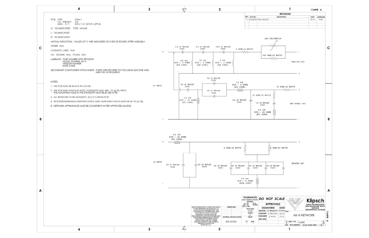 которые сильно отличаются от AK-6, схему которых как положено для новых кроссоверов Klipsch не афиширует, но есть схема AK-4 (схема AK-5 отличается только одним резистором в фильтре вуфера против двух):