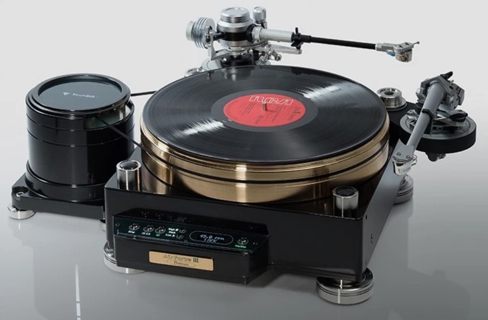 TechDas Air Force III Premium. Выносной мотор, тяжеленная конструкция на 29 кг и 3 506 кг на см2 момента инерции. Ну и воздушный подшипник и прижим. Сохранение почерка пятерки, но шаг вперед по всем показателям - от плотности баса до масштаба и разрешения.