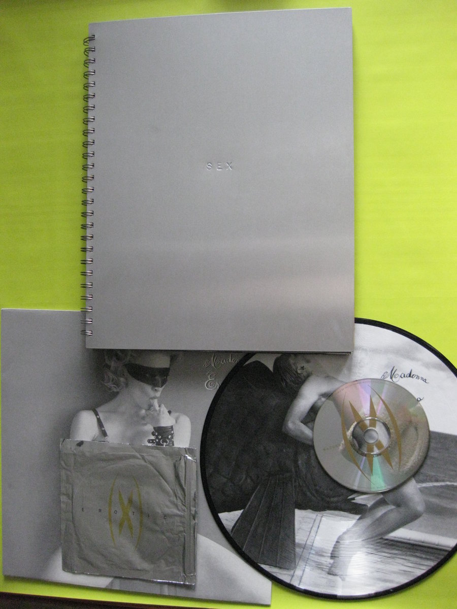 A 128-page book of erotica and sexual fantasies written by Madonna, photographed by Steven Meisel, designed by Fabien Baron and edited by Glenn O’Brien. The spiral-bound, metal-covered book is wrapped in a silver mylar bag with a copy of “Erotic” CD single (an exclusive remix of “Erotica”), and includes an 8-page comic book.