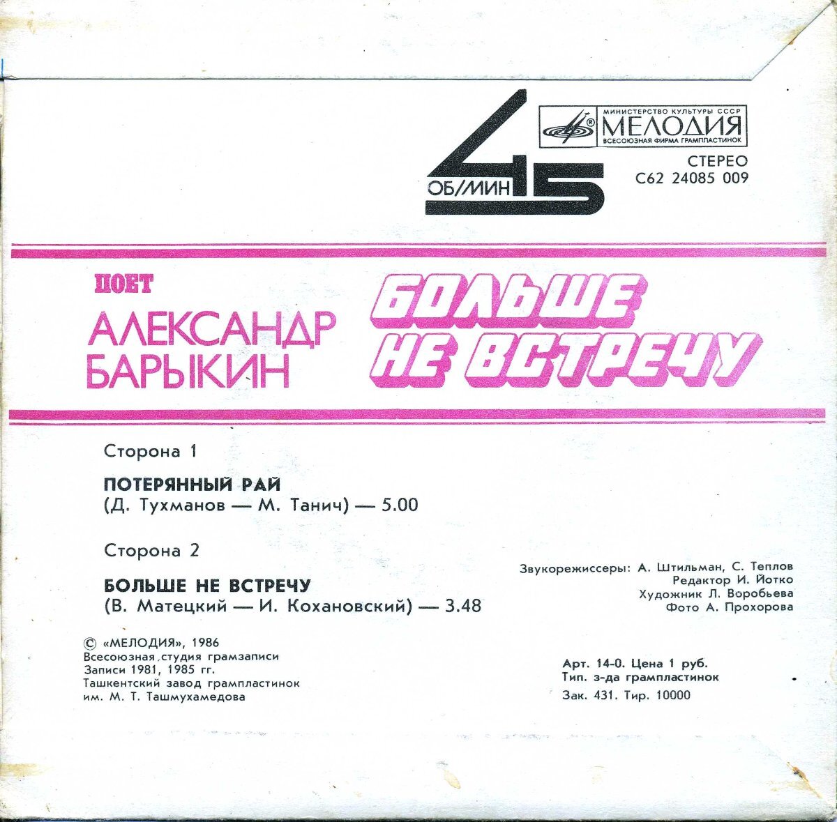 А на виниле Потерянный Рай вышел только на сборнике Танича.