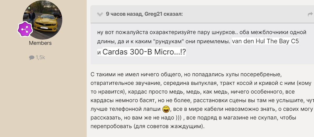 По аккустике сейчас по наличию в разном метраже VDH сноу лайн (белый), такой же по внешнему виду но в голубой изоляции (название не помню блю вотер кажись), роял гибрид (зеленый), 122 гибрид, небольшой отрезок по внешнему виду как122 но в бронзовом цвете, месяц назад наконец магнум скинул 5 метров остаток. Могу завтра фотки скинуть если есть не доверие. Так вот ВСЕ VDH имеют один и тот же подчерк, пластмассовую середину, мазаные верха которых в избытке. По CARDAS в наличии слава БОГУ ничего не осталось кроме воспоминаний. А воспоминания именно с прогревом связаны, из коробки не звучит совсем, грел месяцами чтоб продать.