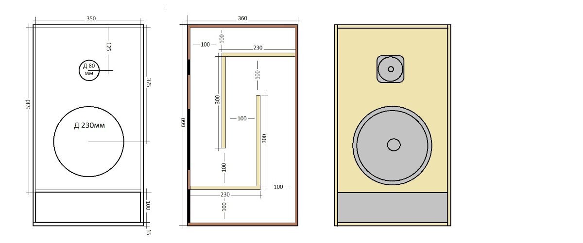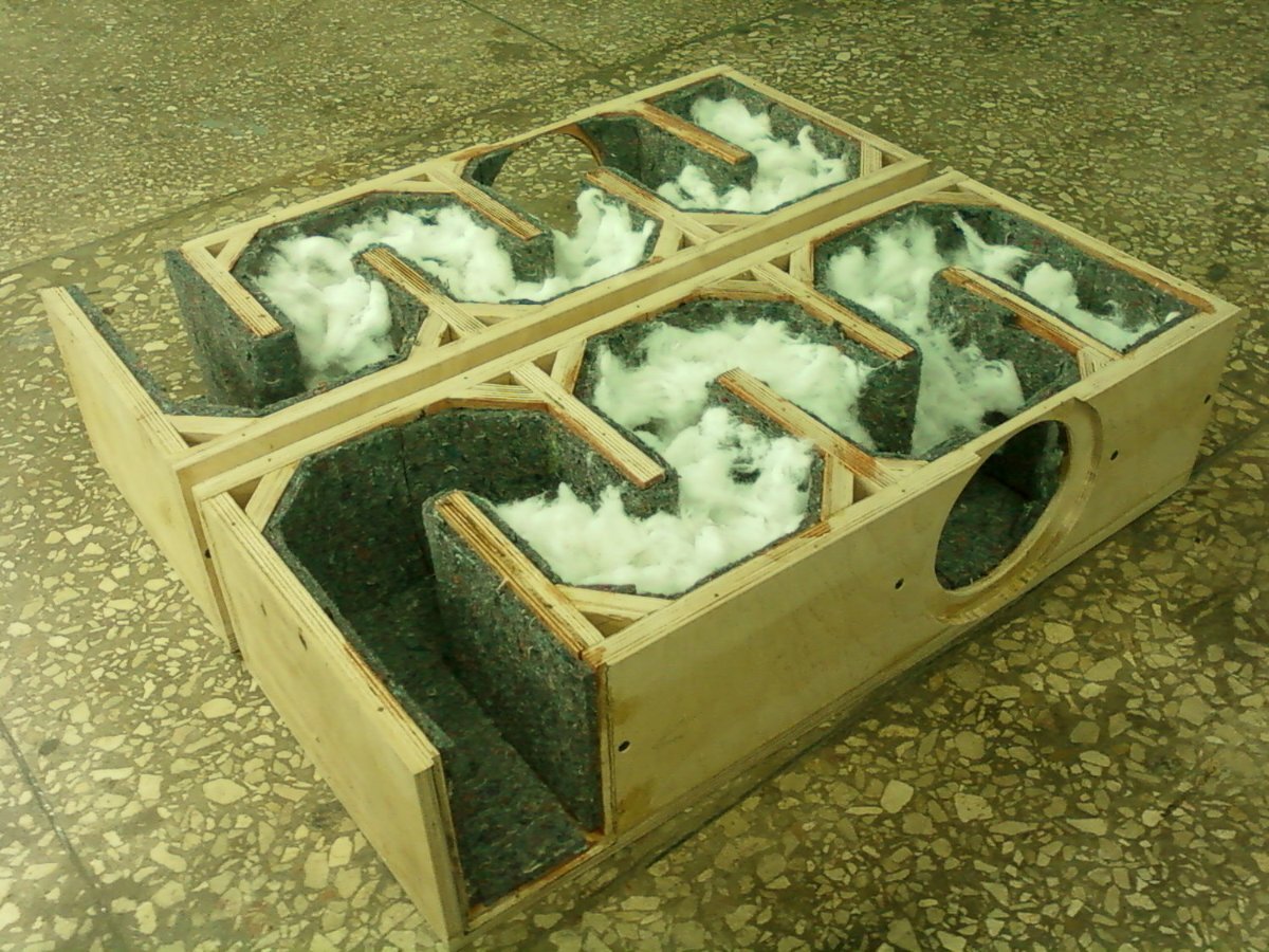Предлагаю желающим самостоятельно построить акустическую систему несложный проект акустического оформления лабиринтного типа. Я придумал и рассчитал его под двухполосный комплект винтажных американских НЧ динамиков Jensen P10 и ВЧ 3,5" фирмы RCA, который можно найти в моих объявлениях. Это четвертьволновой лабиринт, длинна тоннеля которого равняется четверти длинны волны частотой 48Гц, Fs динамиков Jensen P10, сечение лабиринта равно площади эффективной части его диффузора, динамик смещен на треть длинны лабиринта, т.е. соблюдены все требования, необходимые для расчета этого АО.