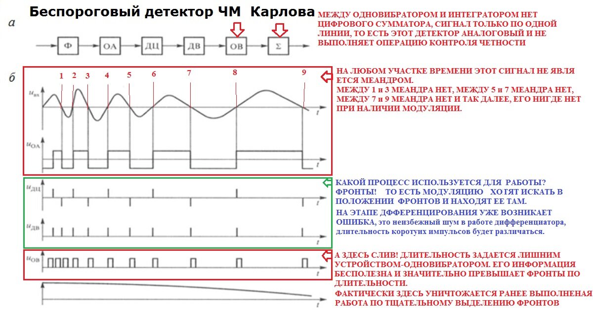 Цифровая схема напротив, используя высокую скорость нарастания фронтов компаратора производит беспороговый прием сигналов от нуля и вся информация превращается в импульсы, Ресурс повышения СШ в цифровой схеме образуется за счет схемы контроля четности, четность пропускает, нечетность нет.