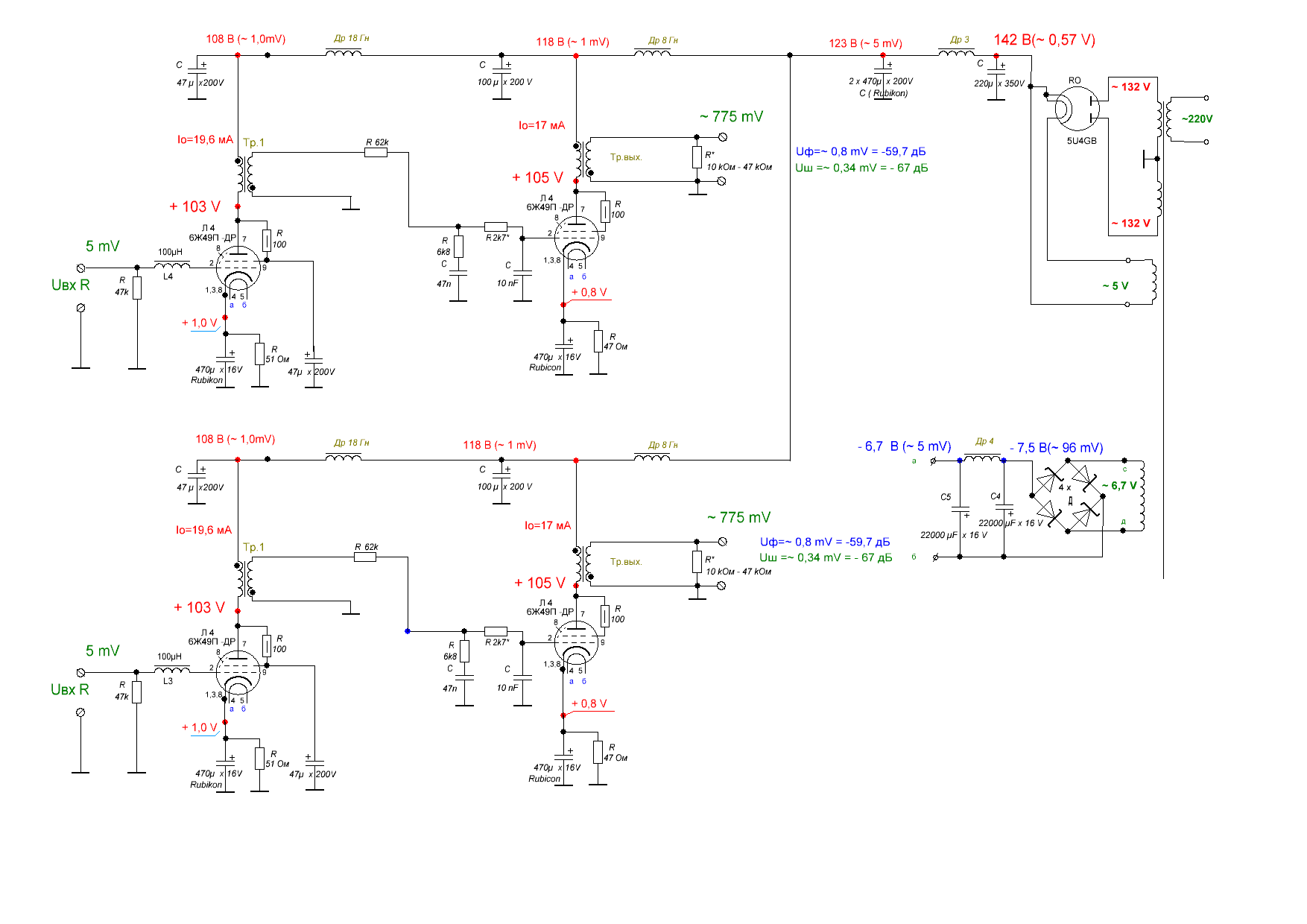 Δf – 19Гц ÷ 26 кГц; Rн = 110 кОм ; (триод)