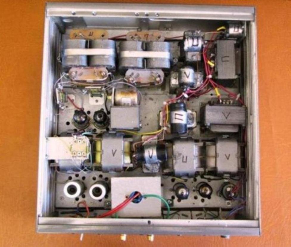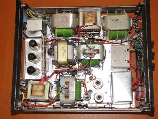 Корректор для винила это больная тема для всех меломанов, аудиофилов и просто любителей музыки. Впервые мысль применять трансформаторные каскады появилась после того как прочёл статью «ФИЛОСОФИЯ SPB SOUND» ,посмотреть можно здесь http://spbsound.narod.ru/SPbSound/pages/spbphil.htm . В этой статье говорится о преимуществе, в плане КПД, трансформаторного каскада над резистивным каскадом. Главная идея заключена в следующей фразе “в трансформаторном каскаде 9/10 мощности сигнала достигает нагрузки (пусть даже при 1/10 потерь в трансформаторе), а в резистивно-емкостном – лишь 1/11 часть (остальные 10/11 выделяются на анодном резисторе впустую!) . В связи с этим возникла мысль – если трансформаторный каскад настолько эффективнее, в плане КПД, резистивного каскада, то и усиливать звук он будет гораздо эффективнее. Математического аппарата, позволяющего оценить эту эффективность, на сегодня просто нет, или я об этом просто не знаю. Затем нашел работы Susumy Sakuma , посмотреть можно здесь http://www10.big.or.jp/~dh/work/pre.html , оказалось что свои корректора он строит по этой же идеологии, т.е. на трансформаторных каскадах. Собственно говоря это было последней каплей и я решил проверить свои предположения на практике. Первым был собран макет, фото ниже, на четырёх лампах 6С45П и одной 6Н6П. Результаты превзошли все ожидания, получившийся звук просто завораживал.