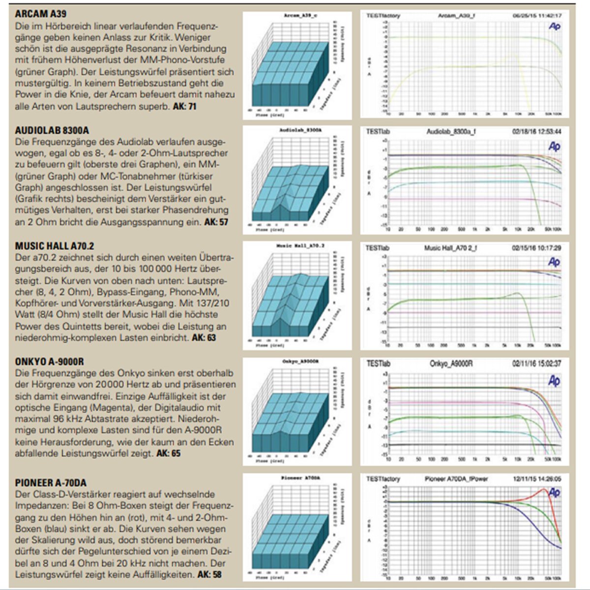 Из графиков выше видно, что справиться с современными АС с кривым импедансом будет очень сложно AUDIOLAB 8300A, MUSIC HALL A70.2, MARANTZ PM8005. Удивил своей мощой ARCAM A39. PIONEER A-70DA в плане производительности неплох, но его кривая АЧХ убивает это на корню.