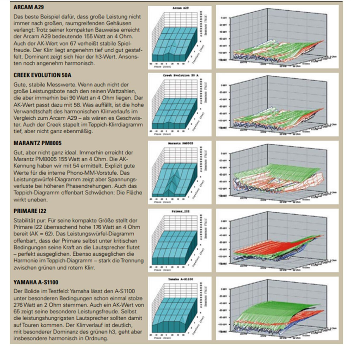 Продолжаю восхищаться прагматичным подходом немцев к оценке аудиоаппаратуры. Это сравнение из журнала AUDIO интегральных усилителей приблизительно одной ценовой категории. Примечательно ,что одним из основных способов оценки приводится “3D график” (голубой параллелепипед) зависимости напряжения (ось Z) от угла фазы (ось X) и импеданса АС (ось Y) АС. То есть график, отображающий способность усилителя “прокачивать” сложную нагрузку (АС со сложным графиком импеданса). Меня это заинтересовало, поскольку публикации подобных графиков я не видел больше ни на одном ресурсе, в то время как именно эта характеристика отражает по сути основную функцию усилителя. В идеале внешний вид названного графика должен иметь форму ровного параллелепипеда, чем больше верхняя грань отклонена от ровной плоскости, тем проблематичней усилитель. В тоже время видно, что на большинстве усилителей в диапазоне от 6 до 8 Ом больших проблем не наблюдается, но ближе к 4 Ом начинаются косяки, и к 2 Ом почти у всех есть завалы.
