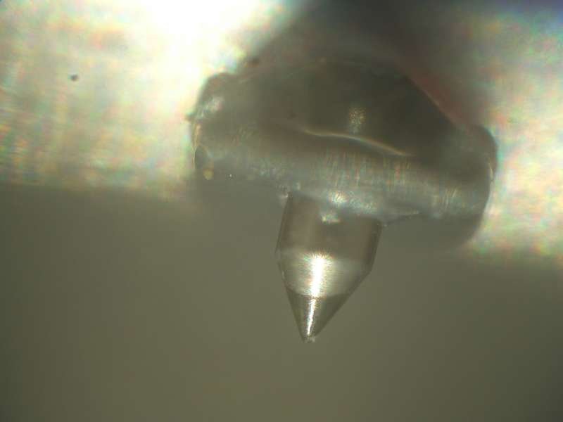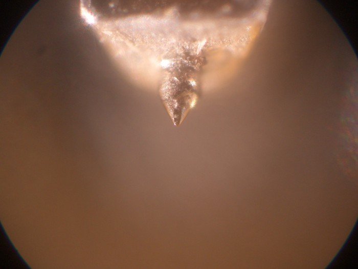 Под микроскопом выглядит примерно так. Нужно поставит правильно свет и ориентировать оптическую ось микроскопа на кончик иглы. На новой не будет никаких следов. На поработавшей, свет будет проходить сквозь лыски (от контакта с пластинкой) и чем более уставшая игла, тем ближе они будут к кончику иглы. На полностью изношенной игле визуально лыски соединяются. То есть износ критический и игла начинает цеплять грязь на дне канавки. Ну и уровень и чистота ВЧ падают. Фирмы могут как угодно указывать на износ. Например по уровню искажений, например не 1% (условно), а 1,2% или еще как то.